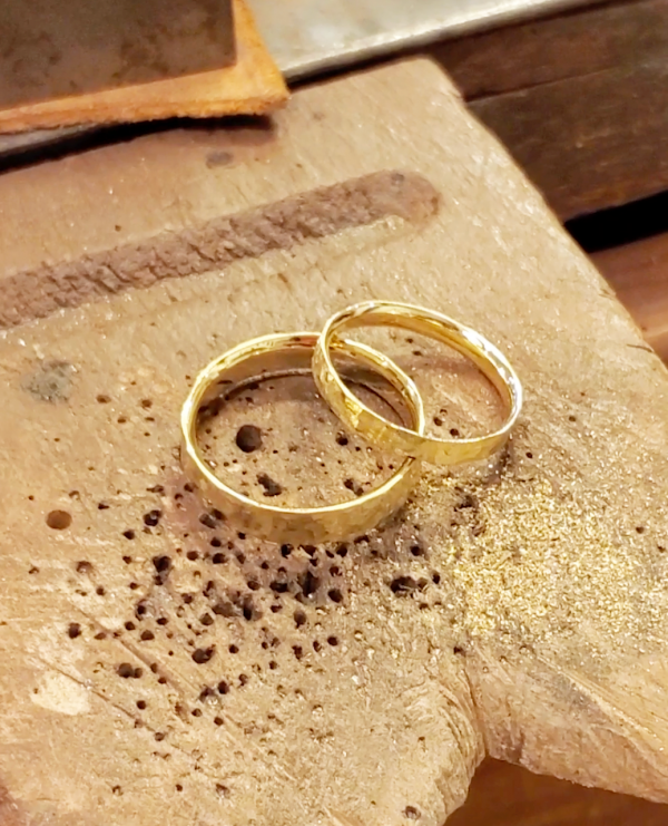 Trabajaremos con técnicas tradicionales de joyería, respetando los tiempos del metal y el proceso artesanal. Desde el diseño inicial hasta la conformación, soldadura y acabado final, cada paso se realiza con cuidado y atención. Existe también la posibilidad de reutilizar vuestro propio oro, fundir una joya antigua, heredada o con valor emocional para transformarla en unas nuevas alianzas. De este modo, el material no solo se transforma físicamente, sino que conserva su memoria e historia.